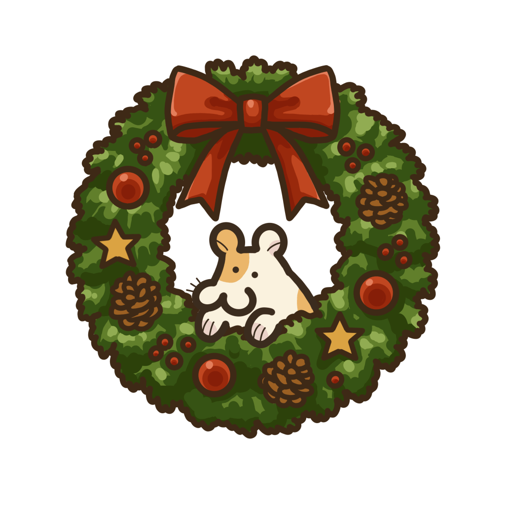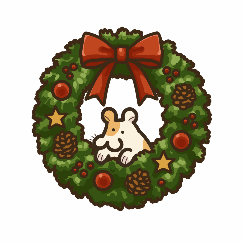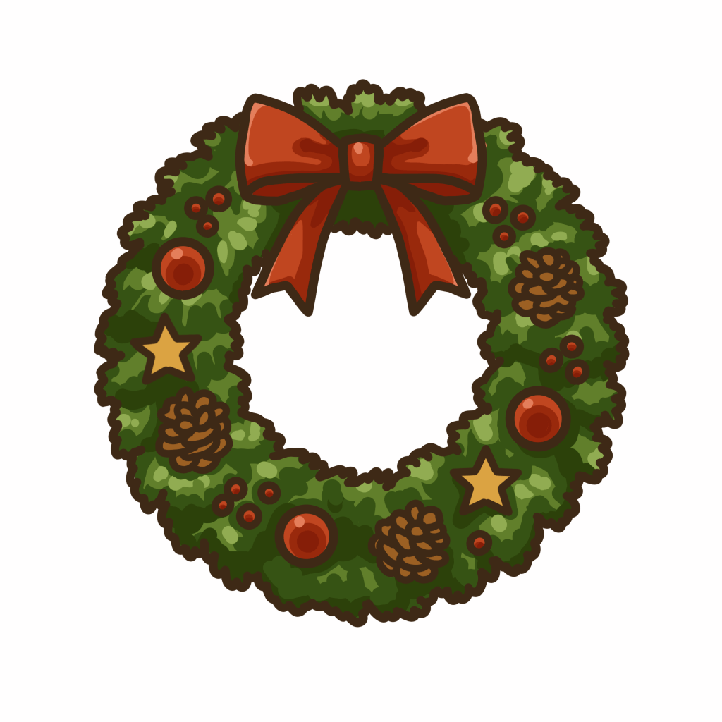 クリスマス気分を上げる華やかなリース。季節感あふれる装飾を丁寧に描いたよ。冬のデザインやクリスマスの雰囲気づくりに最適で、ブログ・SNS・カード素材など幅広くどうぞ。